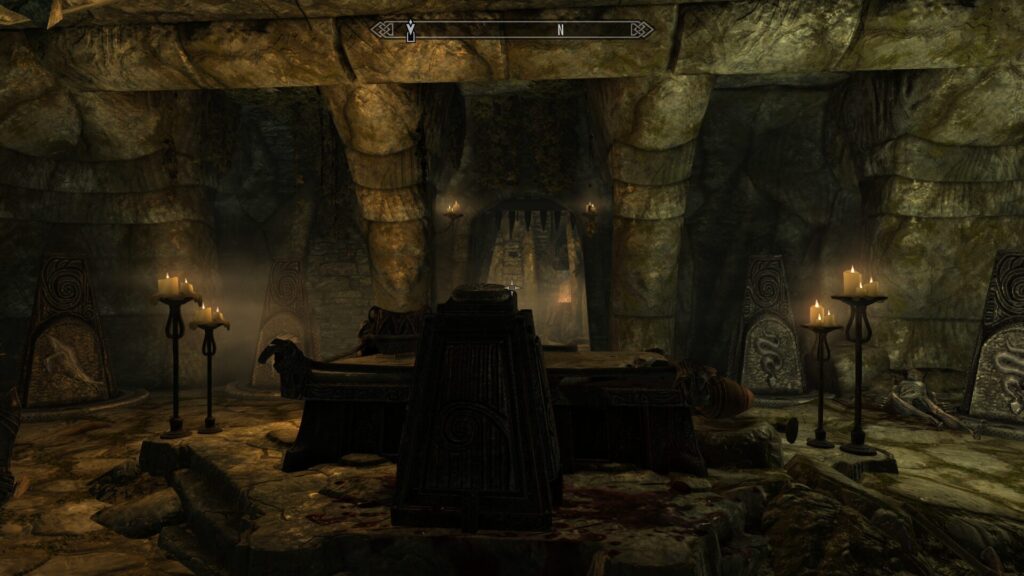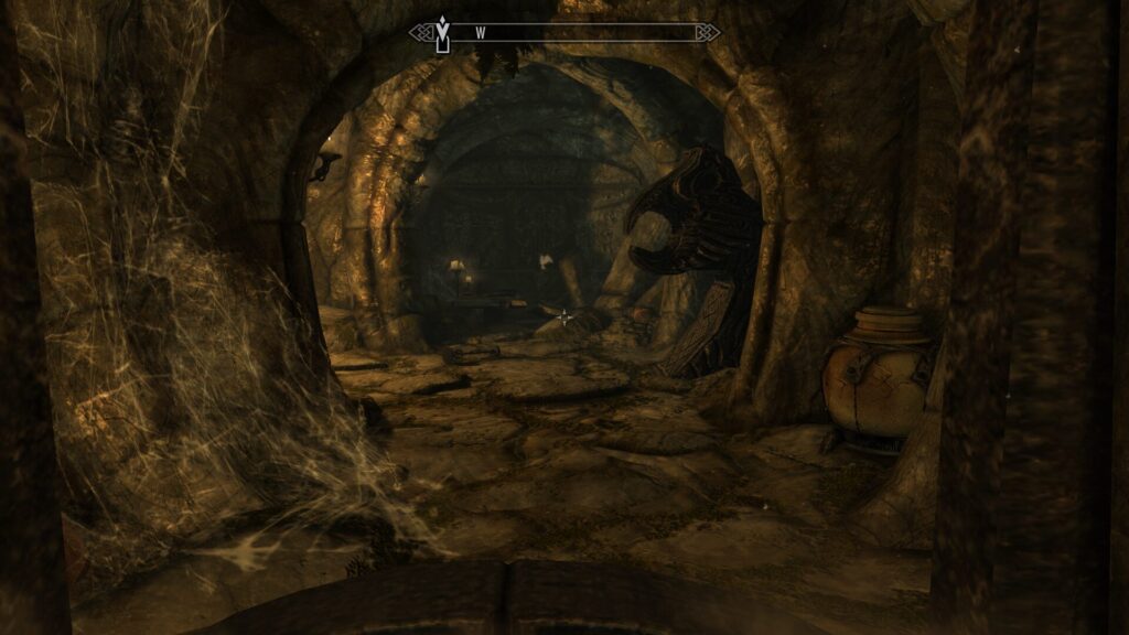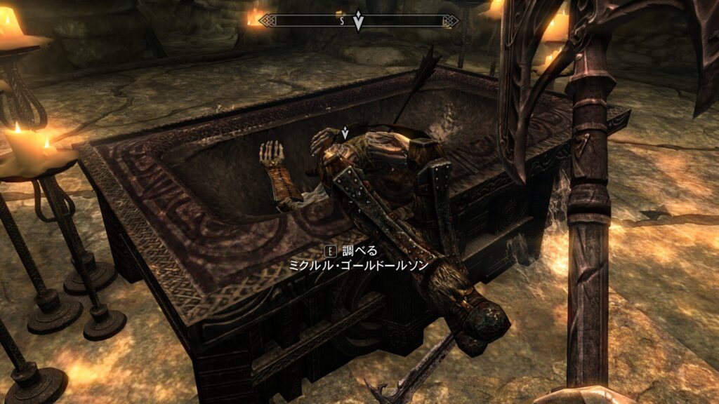 分かりやすく鉄格子があったので嫌な予感はしてましたが、相棒と分断されてしまいました!そしてその辺の棺桶からドラヴグルがフラッシュモブのようにぽんぽん出てくるという、スカイリムの遺跡ではお馴染みのアトラクションが始まります。もうええて!!飽きたもんそれ!!