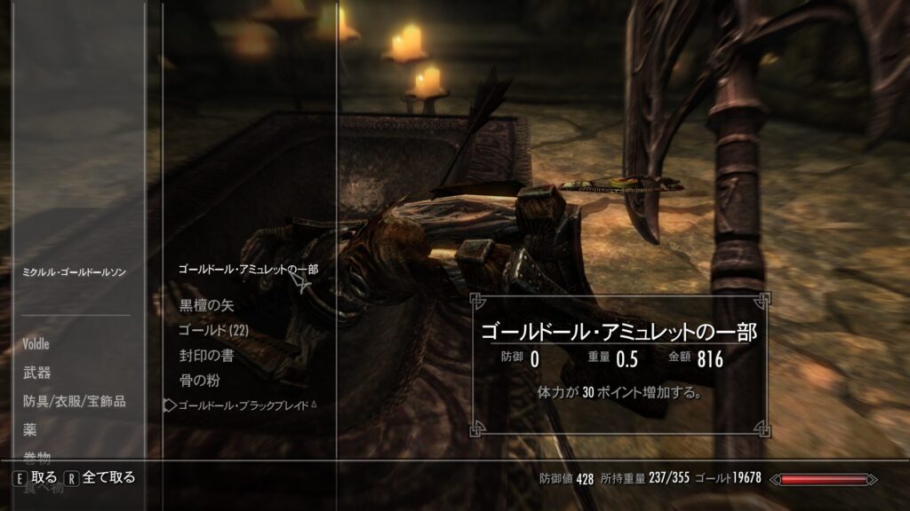 でもそのわりにこのアミュレット、スタミナ30上がるとかいうレベルなんだよな…?3本集めたところでスタミナ90UPとかじゃないですか。それって国家レベルで存在を抹消すべきものなのかっていうのが引っかかるのと、持ち主のゴールドールさんはすごい頭が良くて、すごい力を持っているアークメイジ(魔術師の偉い人)でした。で、その力の源がこのアミュレットなんよな?
