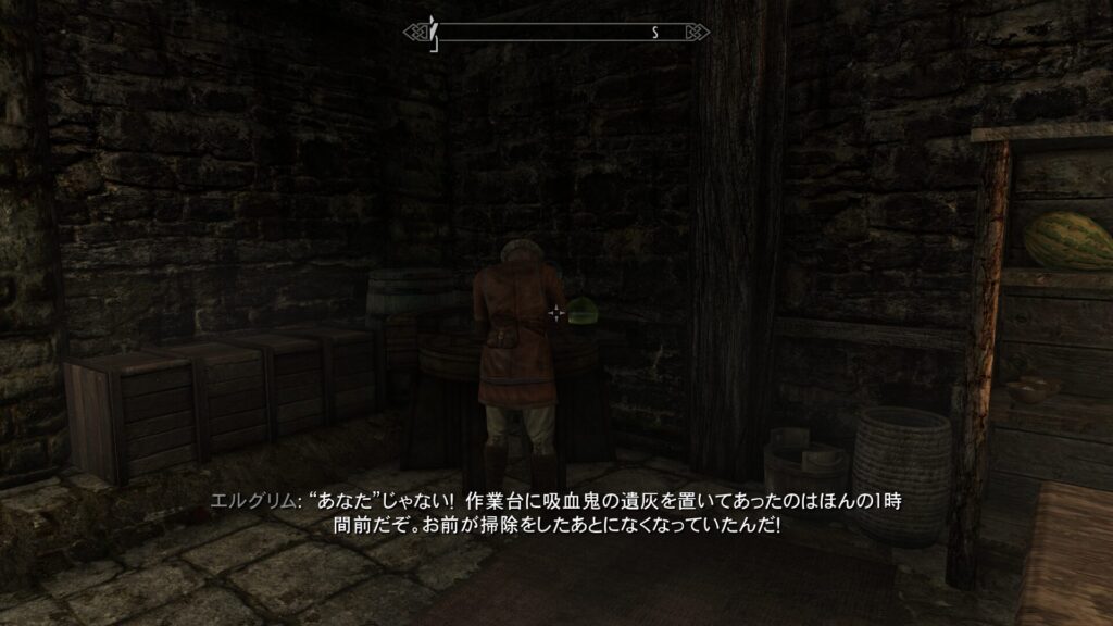 どうやら爺が作業台に置いてた吸血鬼の遺灰がなくなってしまい、「婆が掃除をしたあとになくなったんだ!」と騒ぎ立てているようです。よくある夫婦喧嘩ですね。ところがハフジョルグ婆は「知らんわ!最後に触ったんアンタやろ!」とか言わないんですよ。