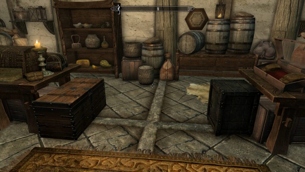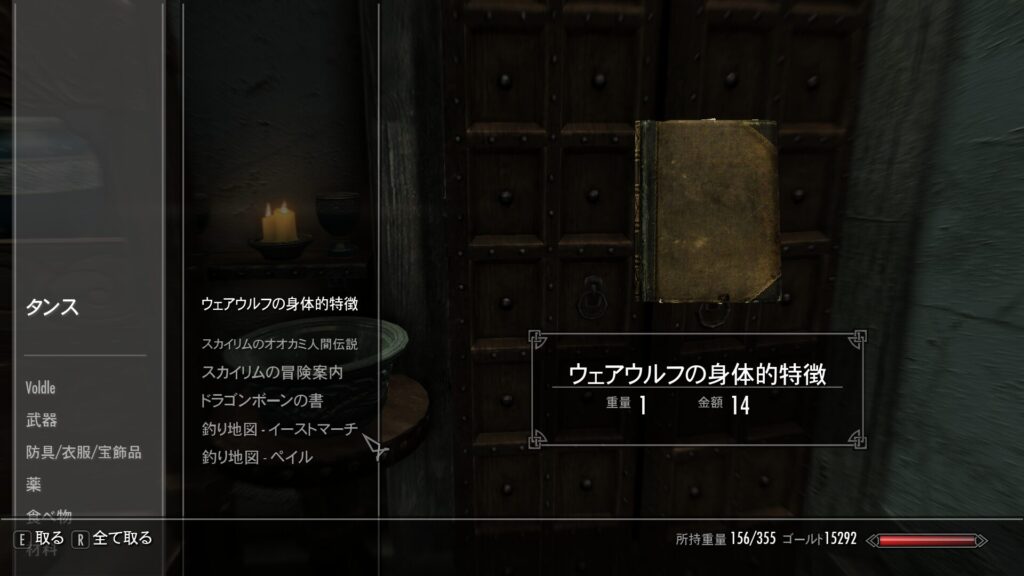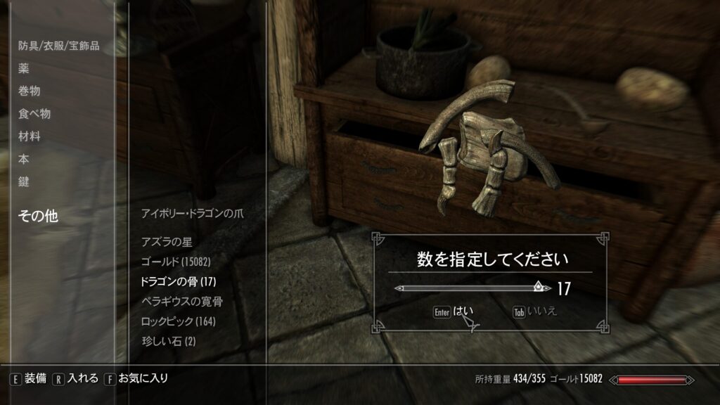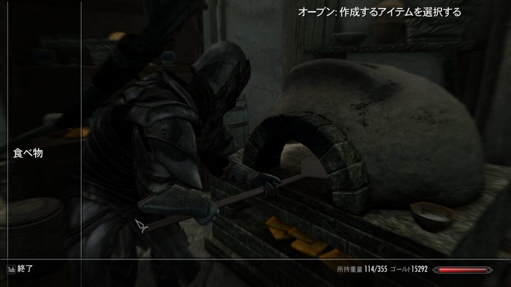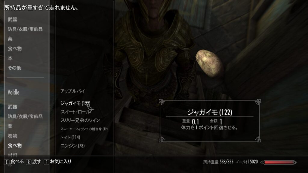 武具は絶対数往復しなきゃいけなくてしんどいだろうし、最初はとりあえず手軽そうなところから行くか!と思い、ホワイトランのブリーズホームに置いてるご飯類を持っていくことにしました。気軽な気持ちで「よっこいせ~♪」と全部持ちしたら…