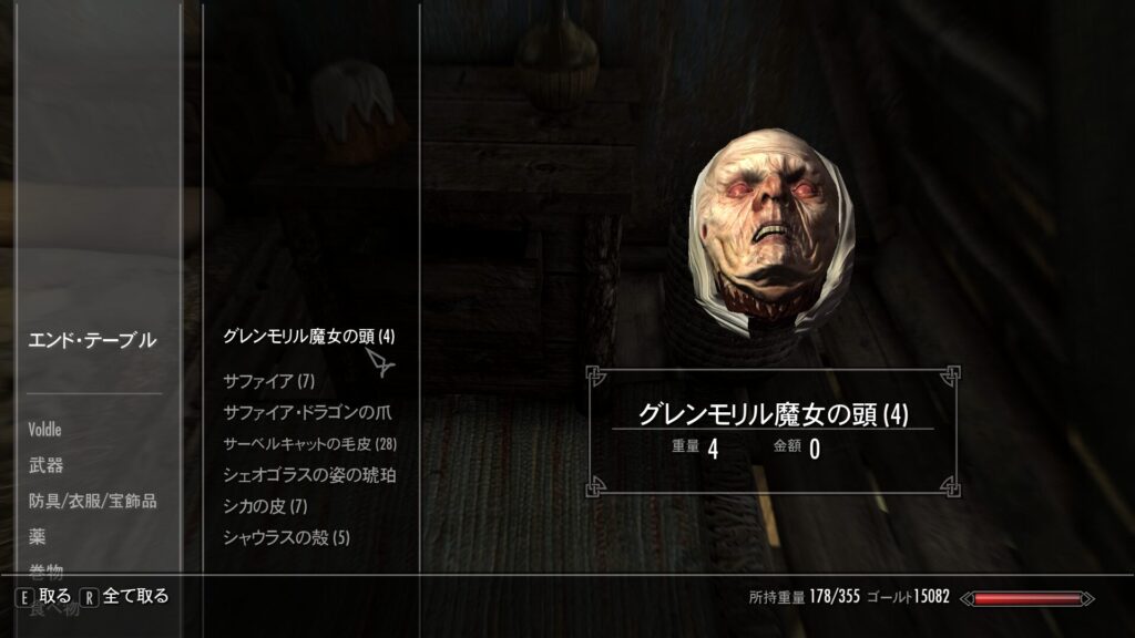 なっつかしいな!これ同胞団クエストの時にゲットしたBBAの生首やないか!他にもホワイトランの従士になった時の斧とか、同胞団イベントしてた時に使ってた狼鎧とか出てきてすっげー懐かしくて楽しい気持ちになったな!!