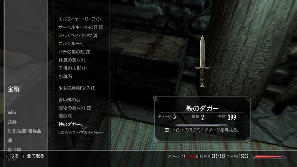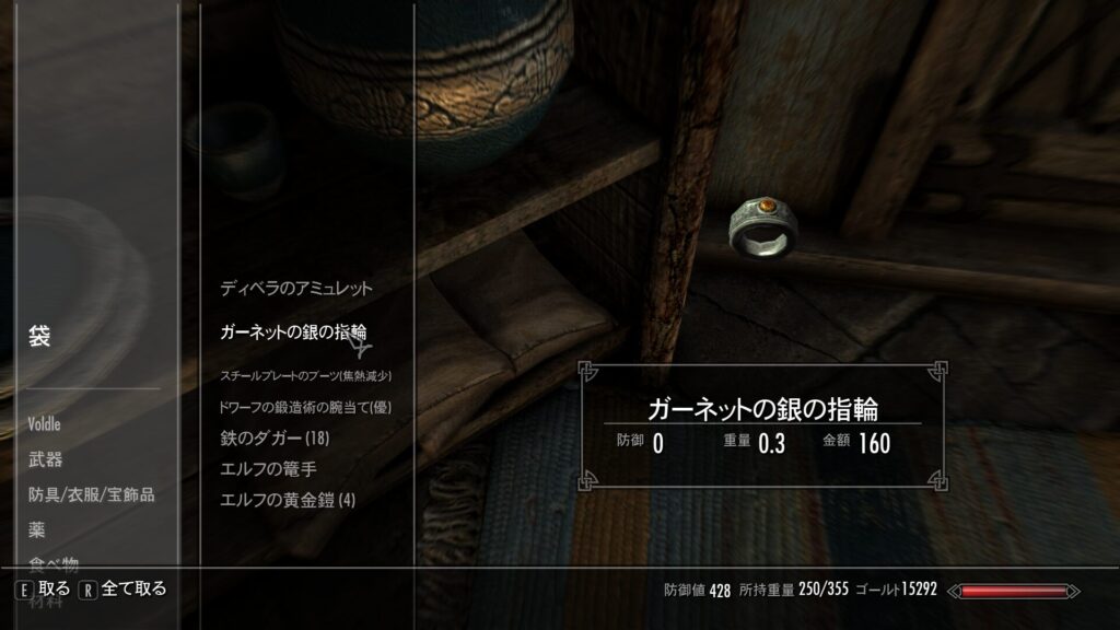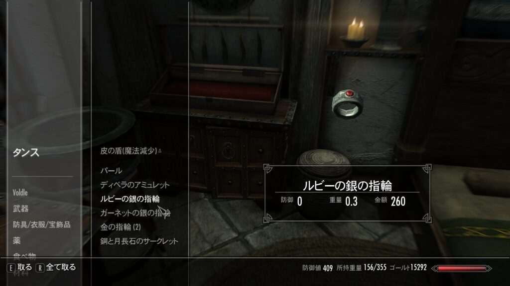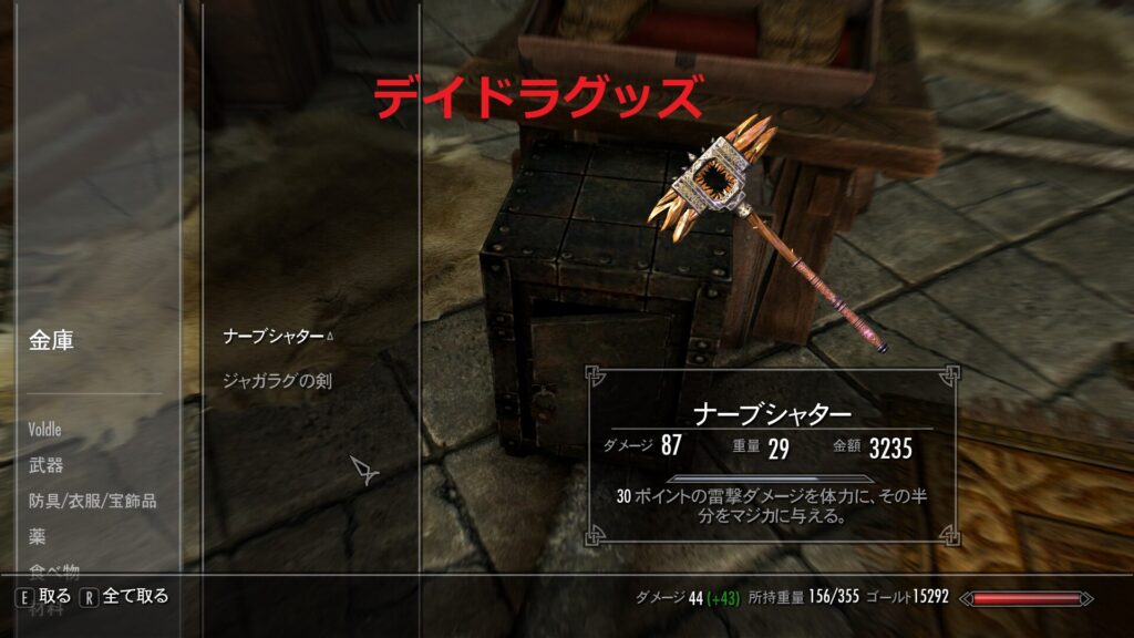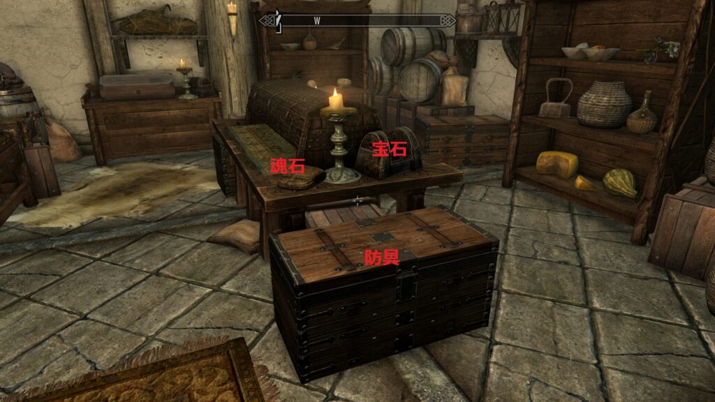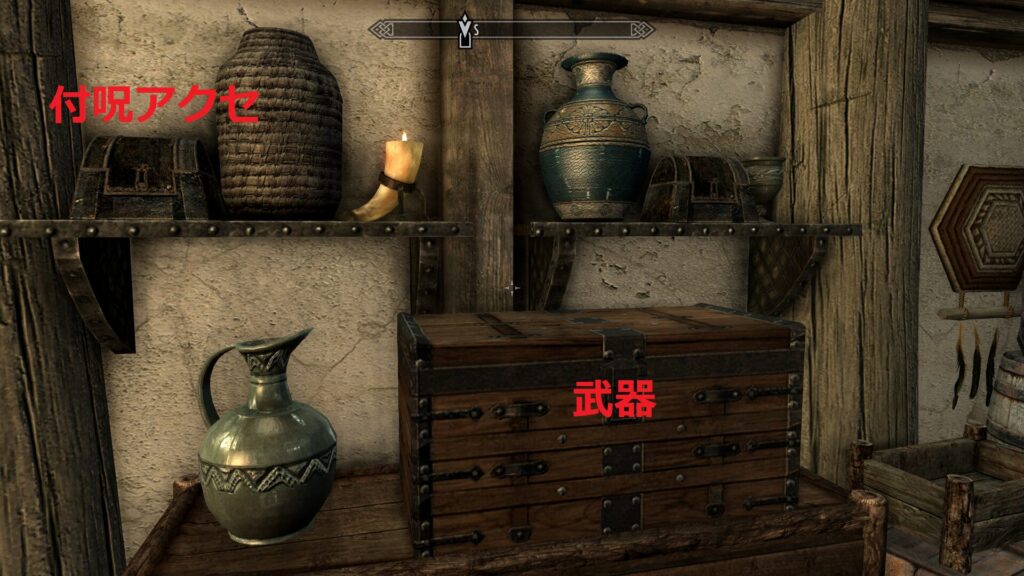 まず入ってすぐ左手のこちら。武器と付呪アクセが入ってます。