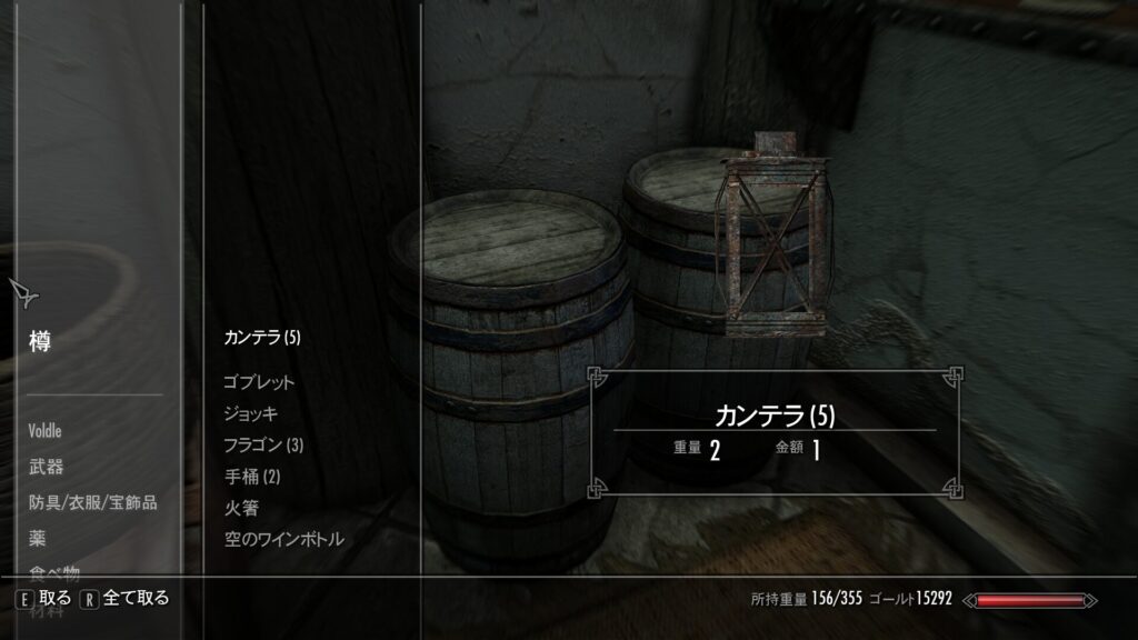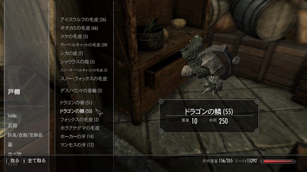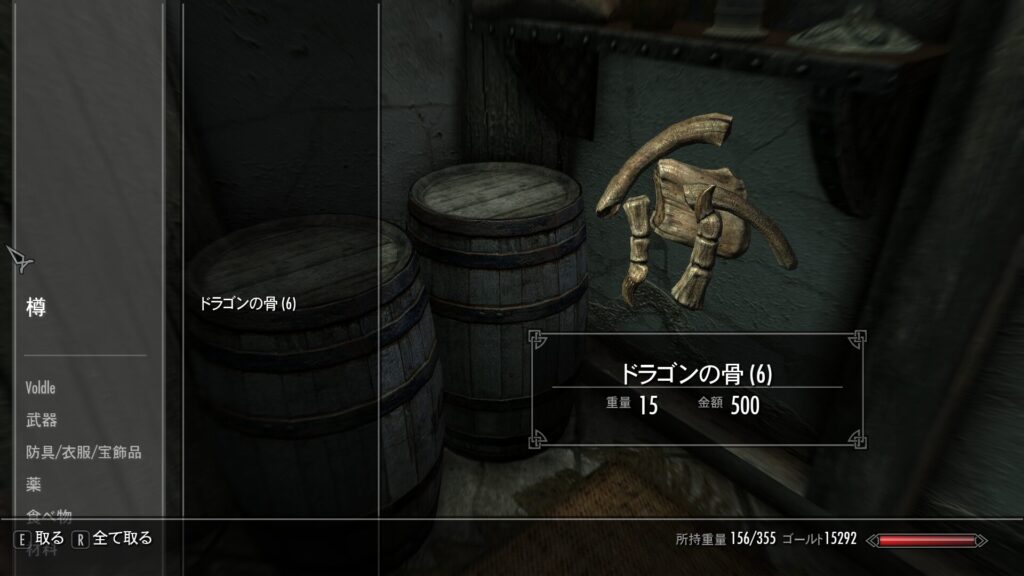 左の樽は釣りで拾うガラクタ、右の樽にはもうこれ以上いらねーよ!っていうドラゴンの骨を捨てることにしました。あの骨、ほっといたら無限に溜まる上に重いんだよ!って今回思い知ったからな。