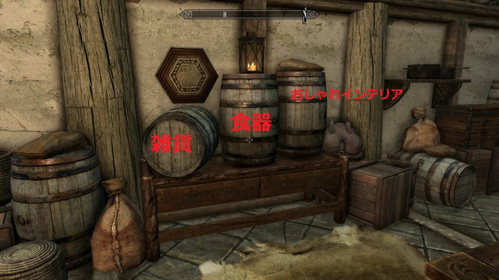 雑貨は籠とか壺とか、そういうありふれたものが入っています。食器は色んなダンジョンとかドゥーマーの遺跡でおパクりあそばしたイケてる食器が入っていますよ!おしゃれインテリアは蝶入りの瓶とかいう洒落たアイテムとか頭蓋骨とか入ってます。