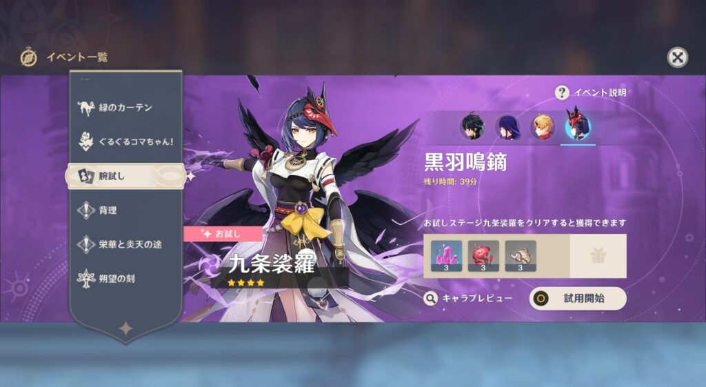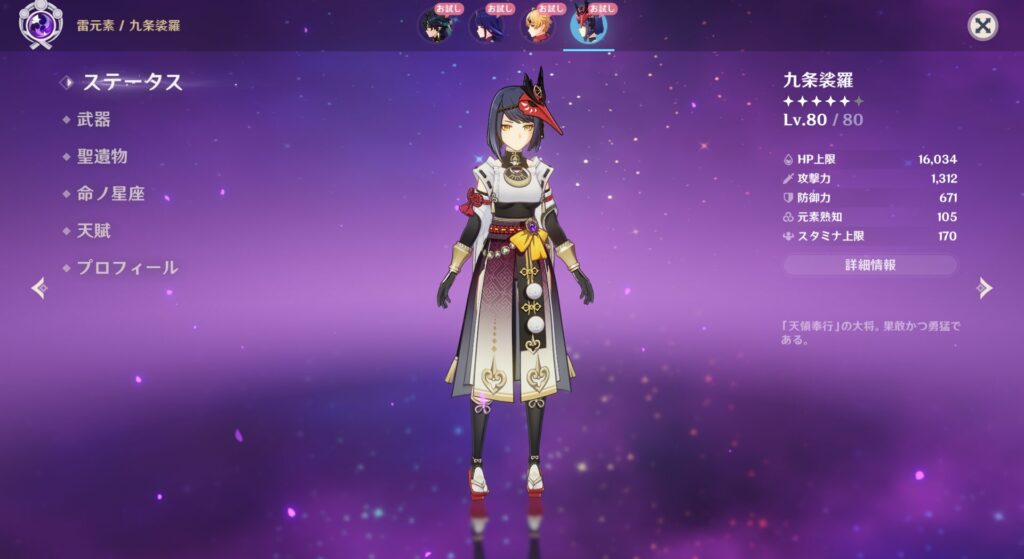 こちらの裟羅ちゃんですが、天狗の血が流れているけど山林で暮らしているわけではないようでして、稲妻のお役人さんだそうです。九条家といういいところの養子として入り、天領奉行として活躍しているんだとか。で、この天嶺奉行というのは三奉行というものの1つであり、治安維持が仕事だそうです。早い話がポリスですね。