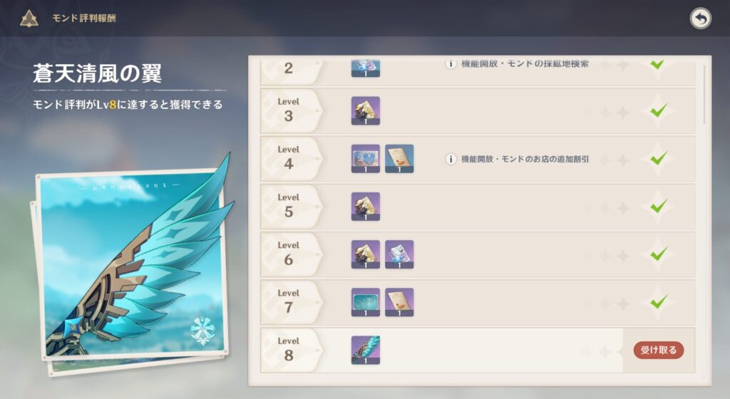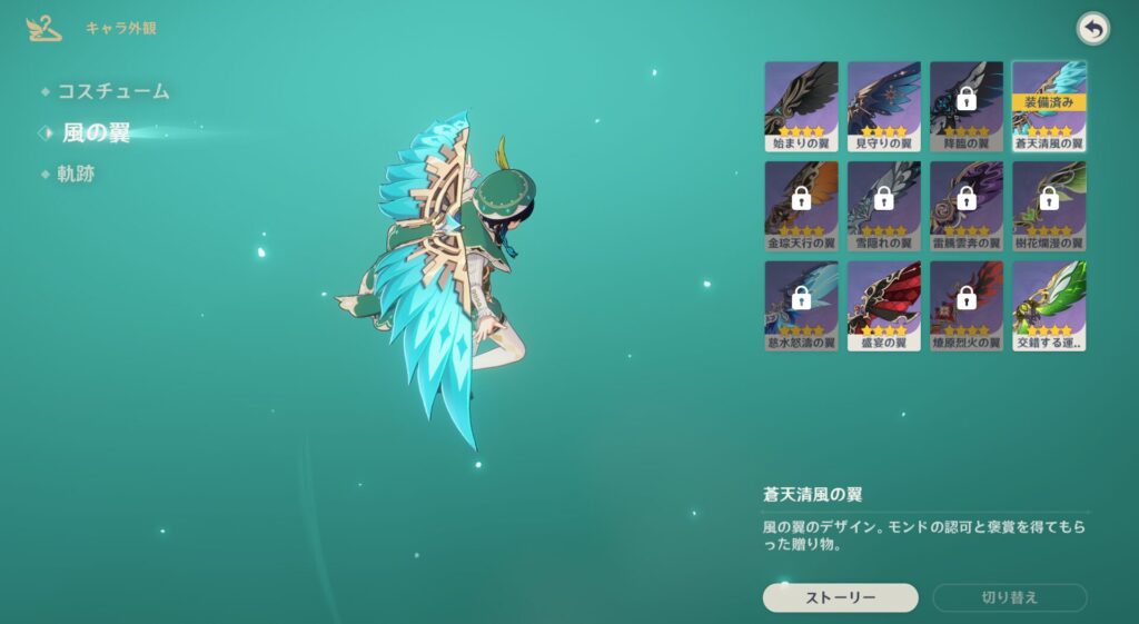 ということで、こちら蒼天清風の翼というものをもらいました。これが欲しくて欲しくてたまらなかったんだよぉ!各都市で頑張れば新しい翼がもらえるのマジで素晴らしいよな。モンドの翼はちょっとメカっぽさが見えるけれど、全体としてトワリンぽくてかっこいいですね!