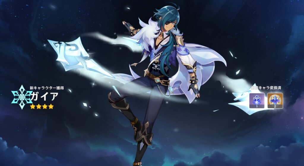 うちって凸1のリオセスリとかいうちょっとした化け物いるんだから氷キャラ引く必要ある?って自分でも思ったんですけれど、今後使う頻度が少ないであろう少女キャラのバーバラちゃんと、友人がやたらと「強いよ!」と勧めてくるガイアさん…どっちを引くかとなった時にガイアさんだったんだよな。