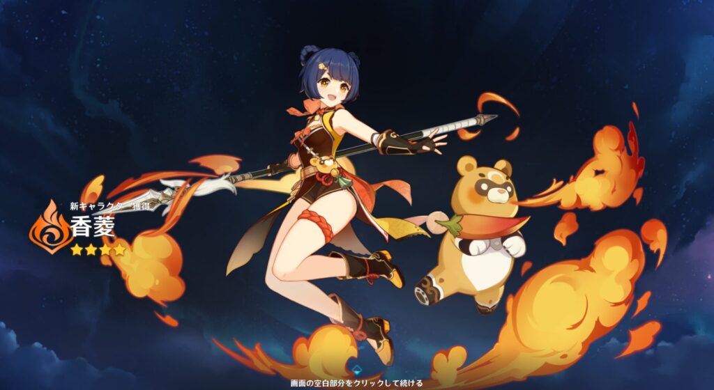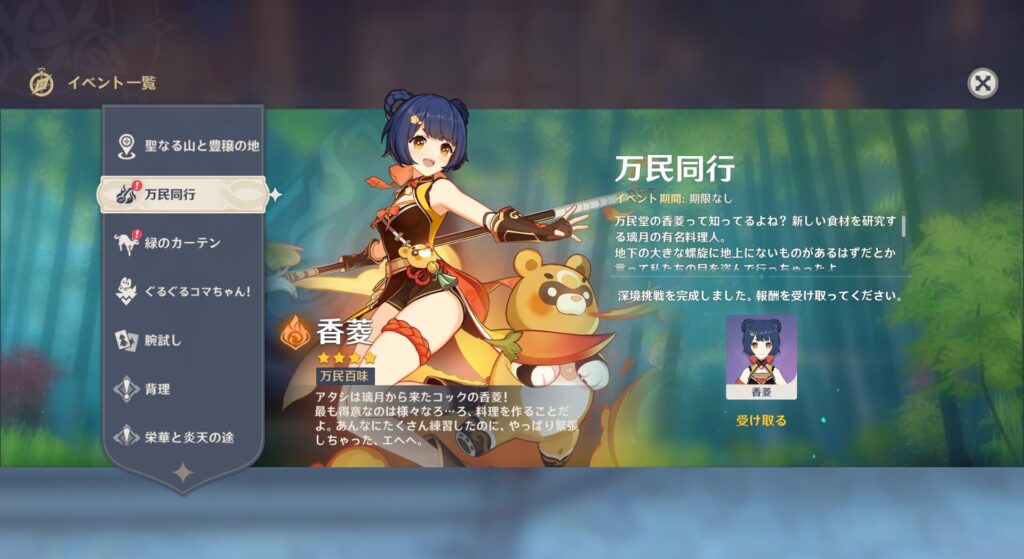 あと螺旋なんちゃらっていう秘境を開けましたので、香菱とコレイちゃんという子が仲間になりました。条件を満たせば仲間になる配布の子たちですね。特に香菱はめちゃくちゃ強いというのを知っていますから嬉しいところです。