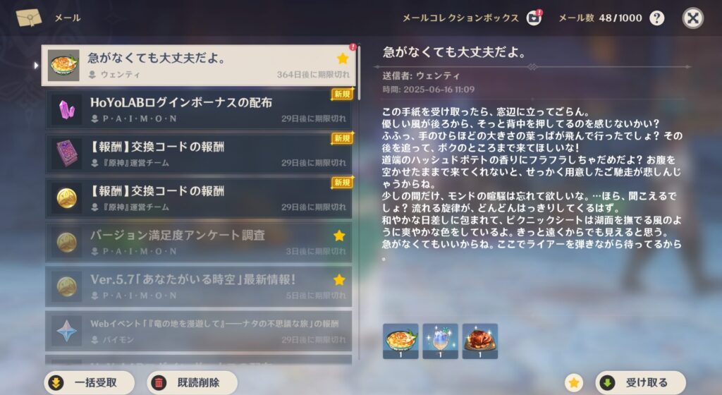 まさかの2行で終わってしまいましたが、大体こんな感じの内容のお手紙でした。あいつらしくていいですね。ちなみにご馳走は風神ヒュッツポットというモンドの伝統料理だったんですけれど、あれ鍋物だよな…?どうやってピクニックに持っていったんや、あいつ…!風神の力でタッパーに絶対液漏れしない圧力を掛けたのかもしれません。