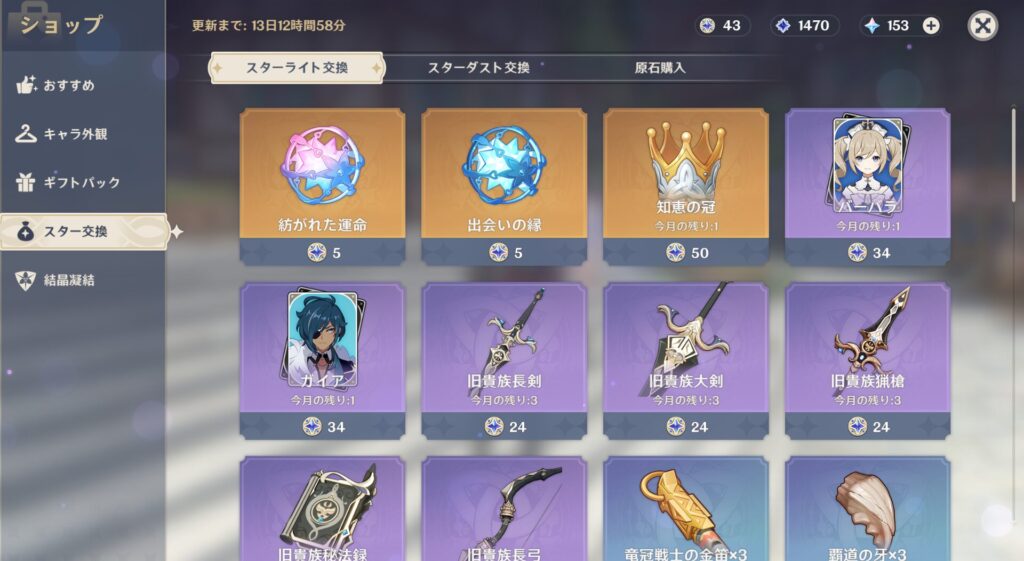で、最近うちのテイワットは毎月課金によって石を多めにゲットできるようになりました。だったら石よりもキャラ引いた方が良くないか…?ってなったんですよ。そして今回からちょくちょくスターライトを砕いて☆4の子を揃えていこうという方針に変えたんです。