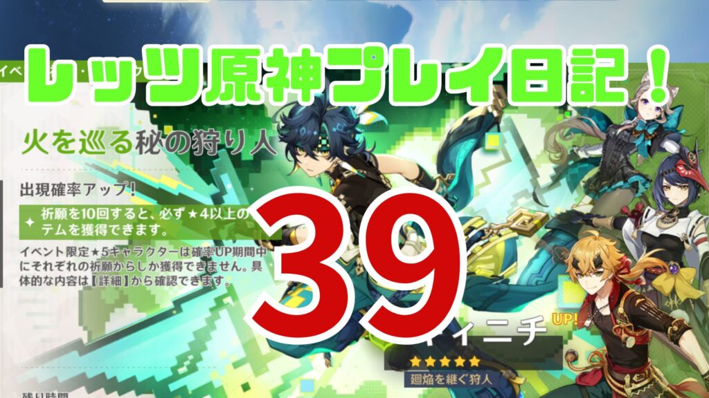 原神のガチャではエフェクトにこの金色の輝きが出ると☆5が到来ということになります。確かこれが40回目だったかな?おいおいおい、わりと早い段階でキィニチさん来てないか?!まだまだ石ありますよ?!