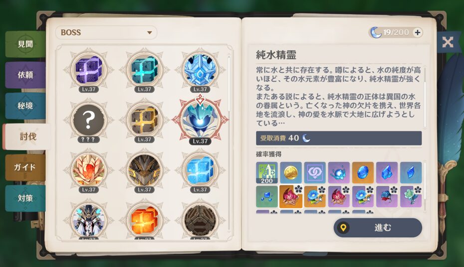 このバーバラちゃんの素材を落とす純粋精霊という奴のデータなんですけれど、これを確認してみたところどうやら水神死んでるっぽいんですよね…で、死んだ神の欠片を持ってフォンテーヌから逃亡したであろう純粋精霊にバトルを仕掛けるとやたら刺客を警戒している発言をしますので、高確率で水神は殺されたのだと思います。