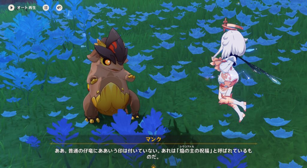 つまりこの拾ったドラゴンは炎神の友達ドラゴンの眷属の可能性が高いでしょう。ただ気になるのが、モンドでドラゴンぽい生命体なんか見たことないんだよな…トワリンって眷属いないよね…?ですが、そもそも龍っていうものをトワリンしか見たことがないので何とも言えないところではあります。