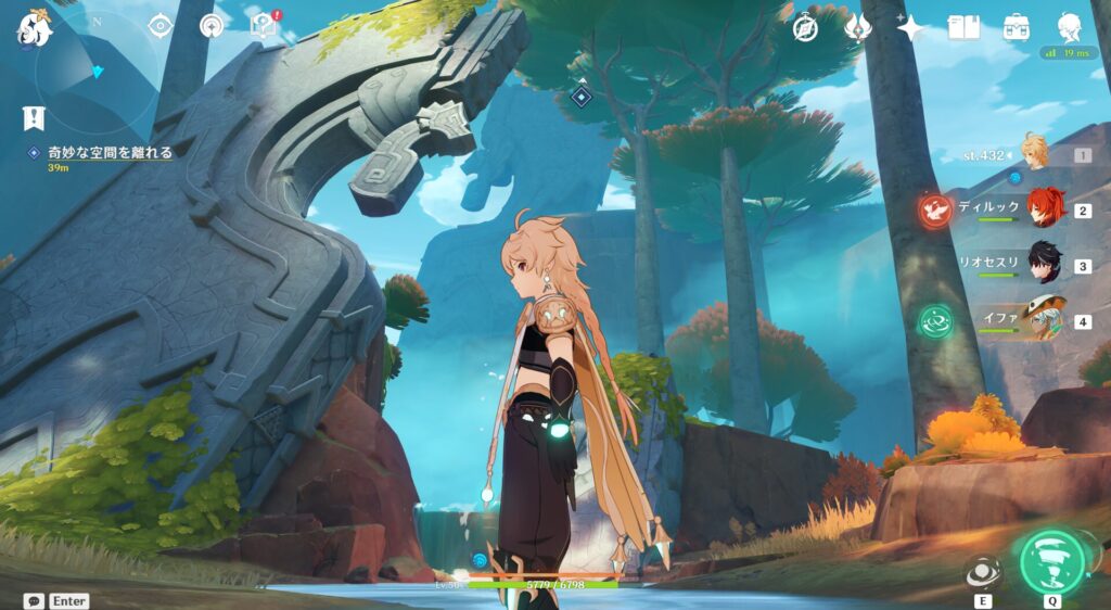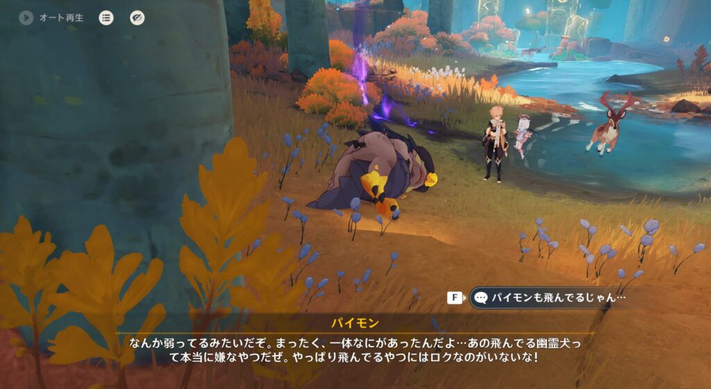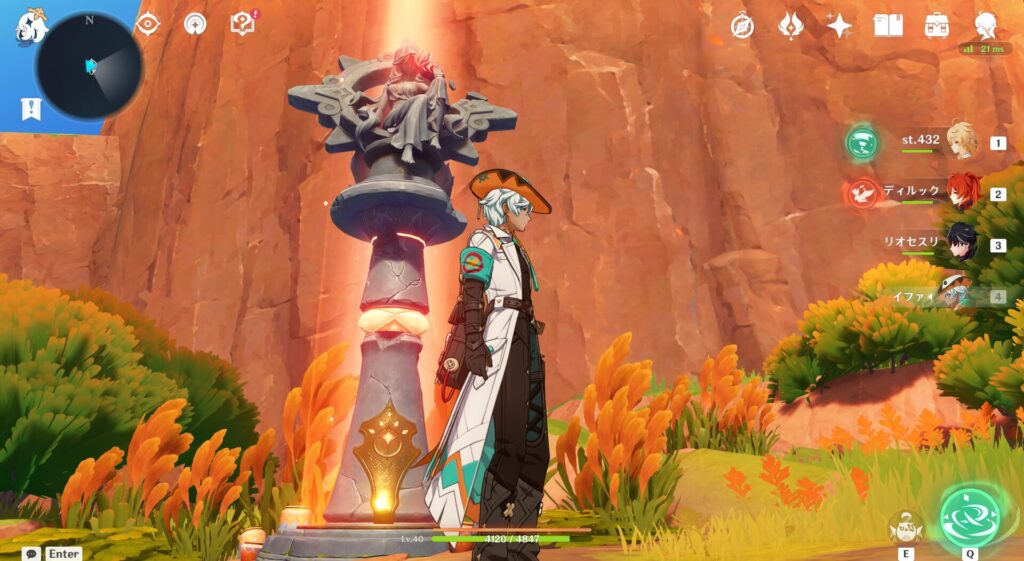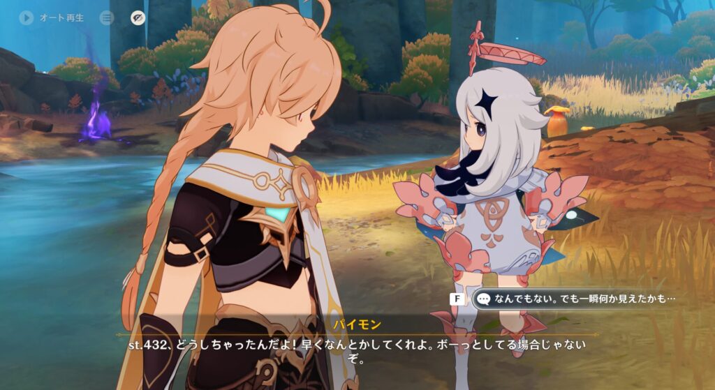 なんかテキトーに誤魔化そうとしたんですけれど、パイモンがノリツッコミしてきました。お前も432さんの連れとしてギャグセンスが上がってきたな…で、どうやらこのポワーンの一連のことなんですが、他の神像に触った時にはもっと安定した繋がりができた気がするのにそれがないということらしいんです。なんか元素の力が弱いんだって。