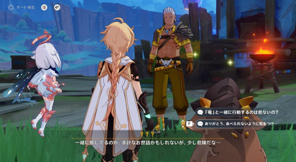 ところで、ふらふらしているうちにどっかの集落に入り込んでしまいましておじさんに話しかけられました。なんか「お前ら異国から来た感じ?それテペトル竜やろ。仲間?」とうらがんきんについて尋ねられたんですね。そこで「最近拾ったねん」みたいな話を平和にしたんですが…