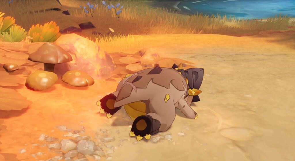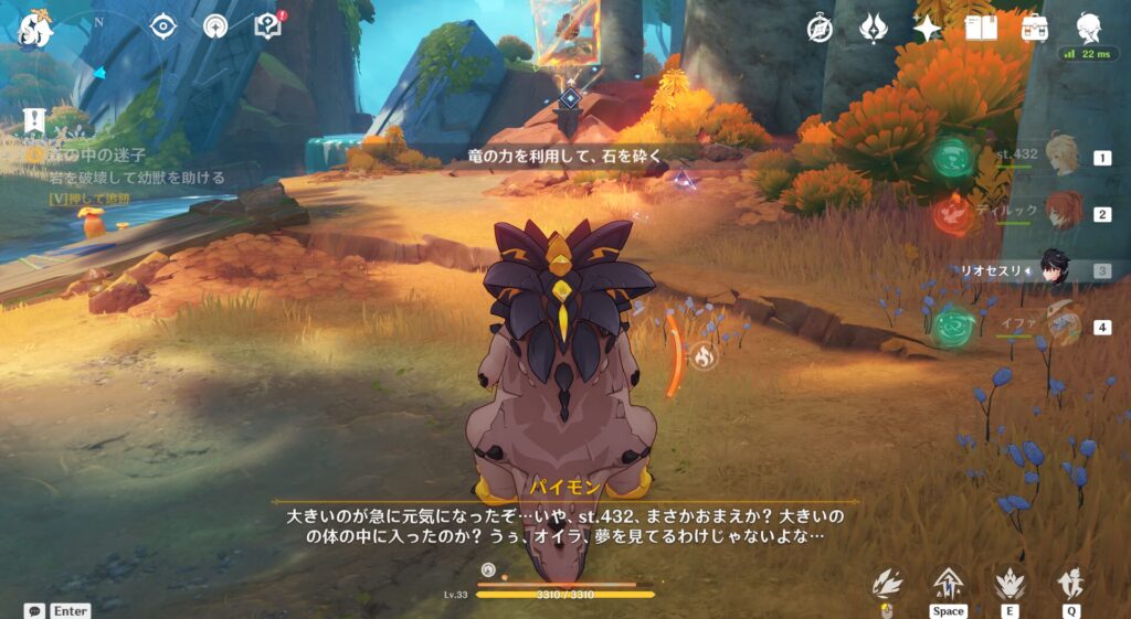 たまに意味深なこというんだよな、432さん。で、このドラゴンについてですが、パイモンが言うにはどうやら龍の眷属のヴィシャップに似ているらしいです。なお、ヴィシャップというのは璃月でたまにゴロゴロしているアルマジロ系の敵のことですね。
