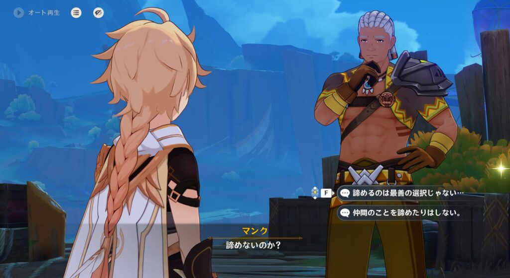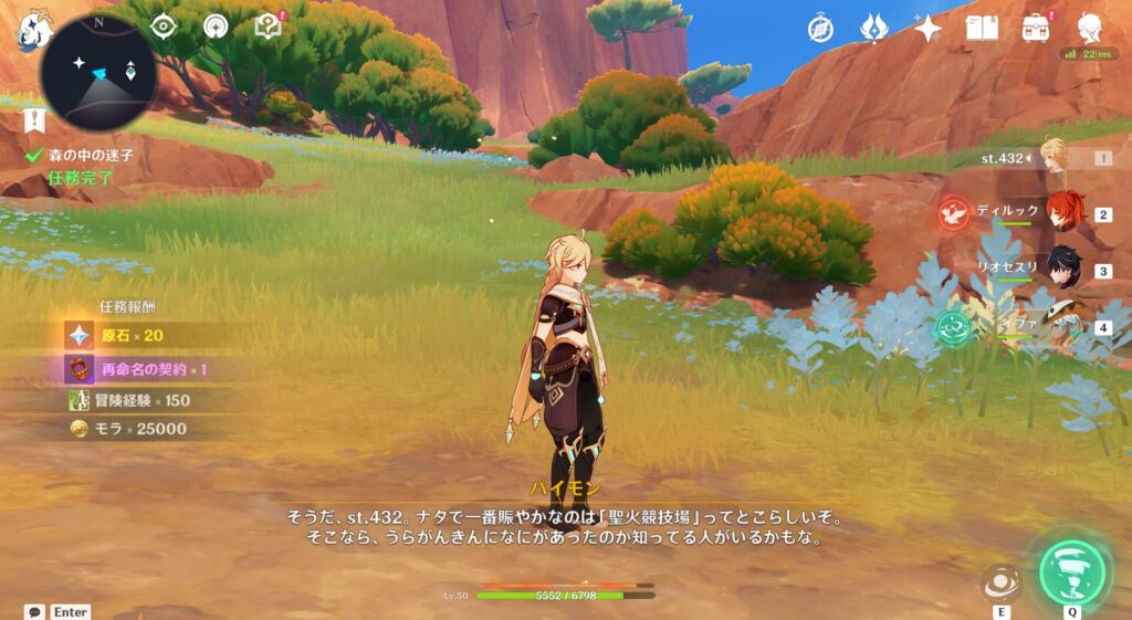 まあとりあえずそれは置いといて、さっきのうらがんきんの話をパイモンに説明しました。で、マンクさんの言うとおりアイテムを集めて火山に行こうぜ!みたいな感じで締めましたので、おそらくこれがナタのメインストーリーなんでしょう。いつかまた戻ってきて続きを進める感じになると思います。