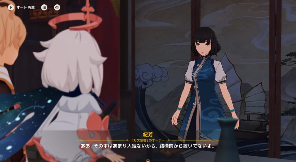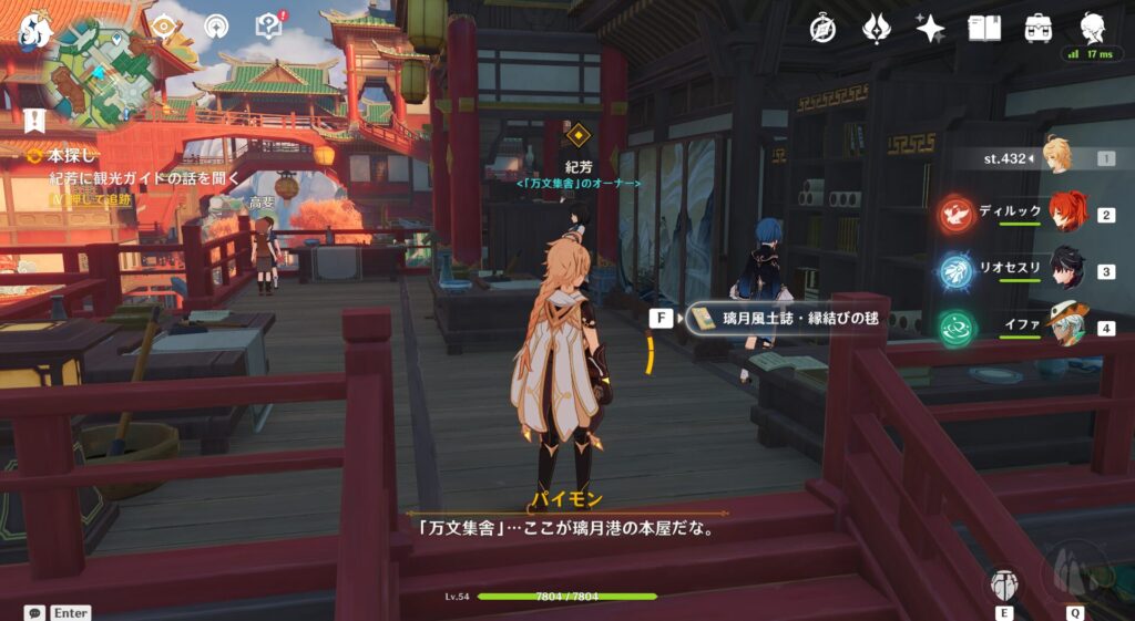 というわけで、モラクス神社の場所を知るべく本屋に来ました!何で本屋やねんって話なんですけれど、実はそれを教えてくれるNPCが別イベント「テイワット観光ガイドをゲットしよう!」に取られてしまっていたので、先にそれを解決に来たんですね。