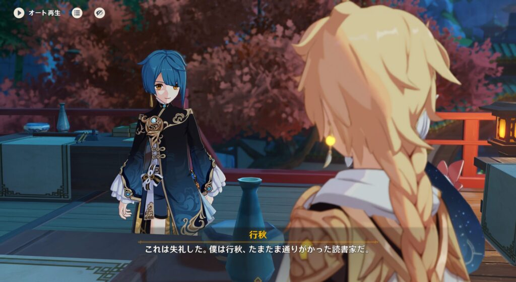 おそらく行秋は璃月で最も強い豪傑…!当然、璃月で最もモテている男と言っても過言ではないでしょう。そんな俺達の行秋なんですが、どうやら432さんが訪ねようとしている本コレクターのところに一緒に行きたいらしいです。実は行秋は読書が好きらしいんですね。おお…!文武両道ってやつじゃん。さすが俺達の行秋だぜ!勿論一緒に行きましょう!