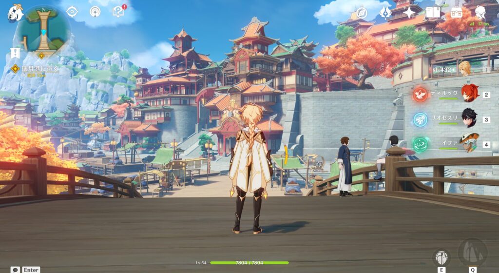 近寄ってみますとこういう感じの中華な町でして、おそらくですがモンドよりもデカい町なんじゃないかということが分かりました。実はモンドと比較して商店の数も多く、町中のNPCの数もかなりいます。すげええぇ…!
