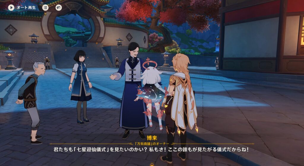 モラクスに会えるのは年に1回だけだぞ!と念を押されたのですが、迎仙がどこでやってるかに関してはパイモンもよく知らんらしいです。お前、テイワットのガイドとかいう話じゃなかったのかよ?!モラクスの正月イベントしてるモラクス神社の場所くらいちゃんと把握しといてよ!!