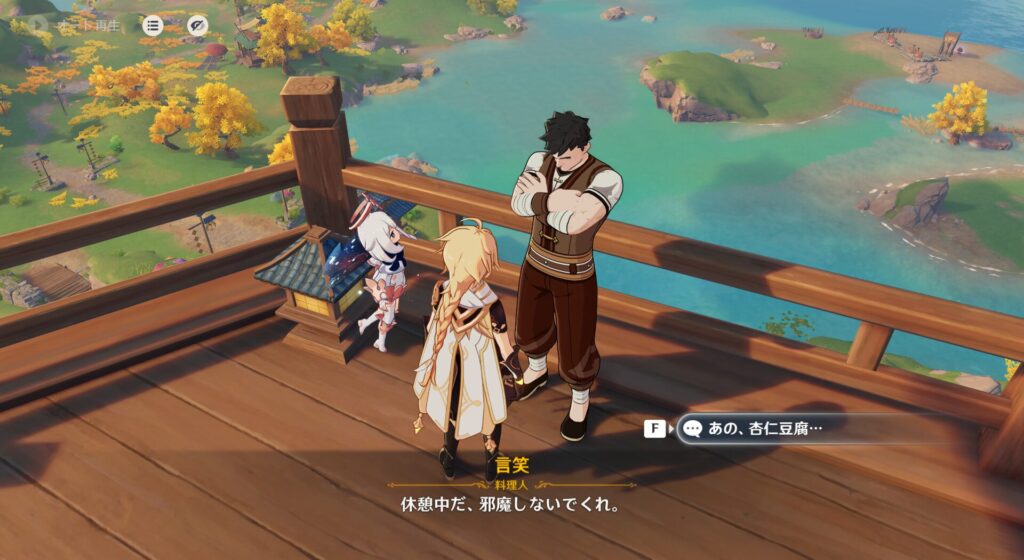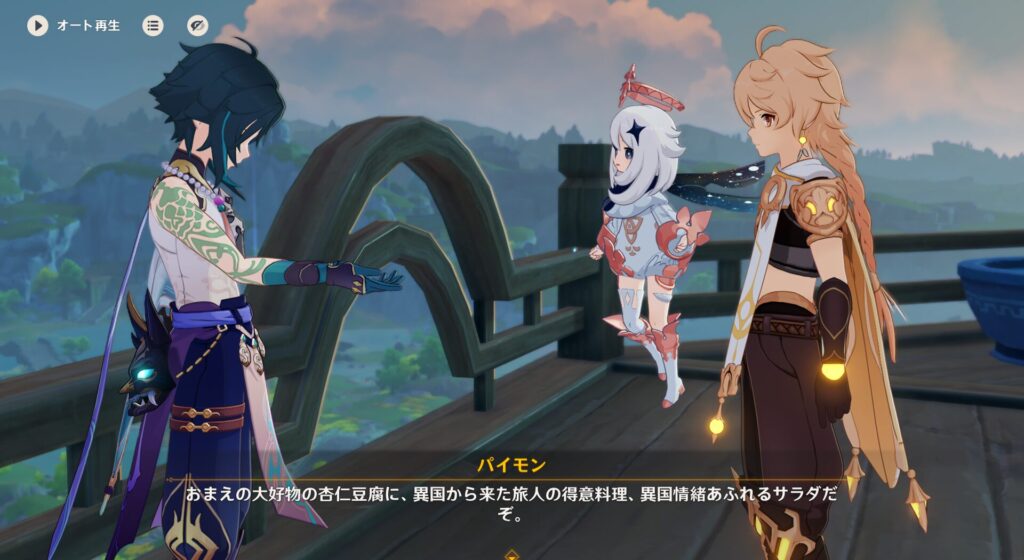 無事にええ感じの杏仁豆腐が手に入りましたので、早速自作のサラダにonして魈のところに向かいました。432さんの真心と仙人の好物のドッキングです。存分に味わってくれよな!!