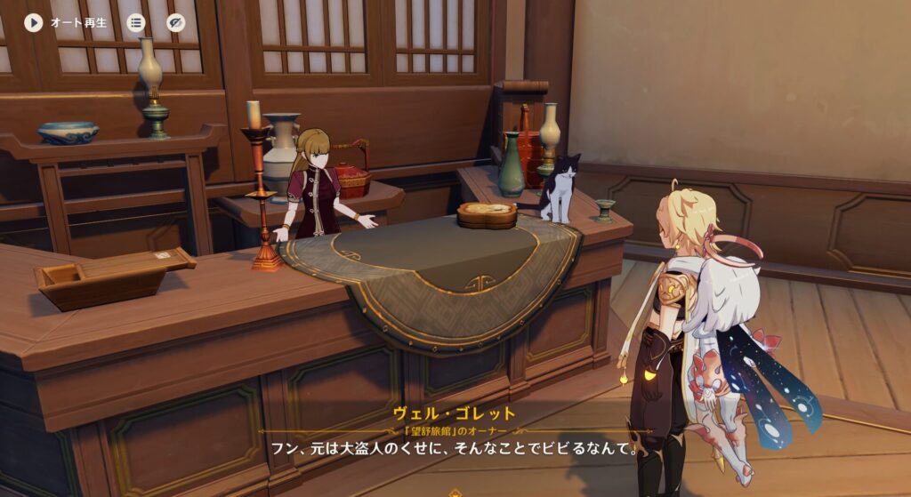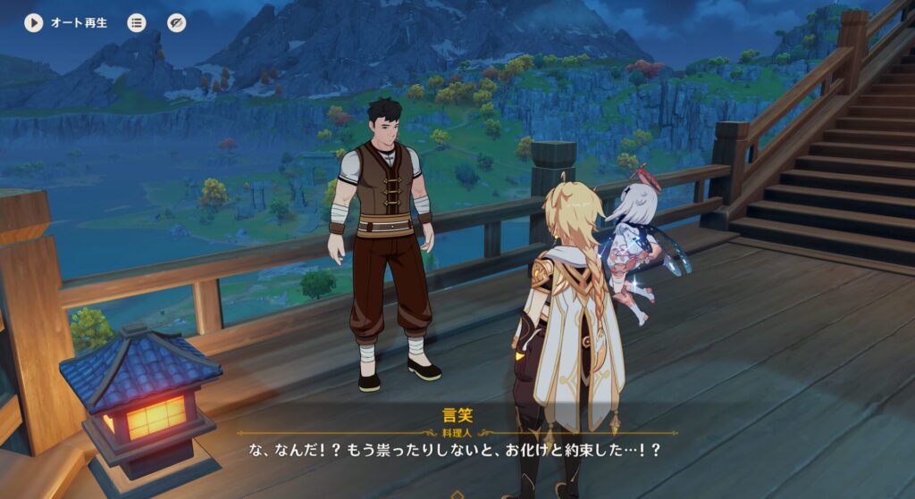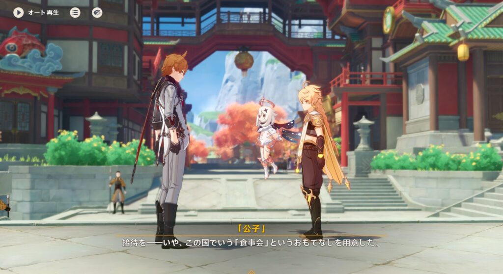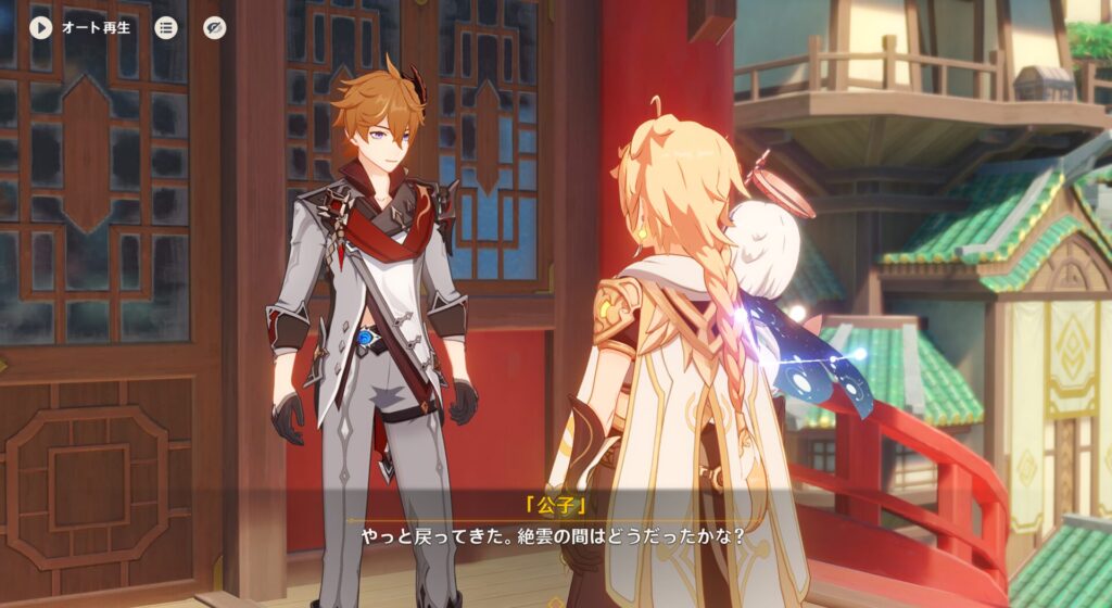 で、料亭に入ろうとしますと、どうやらタルタルはこのへんでも名が知れているらしく様付けで呼ばれていました。こういうところを頻繁に利用しているということは、コイツの仕事は璃月内にいる要人との会合とかなんでしょう。
