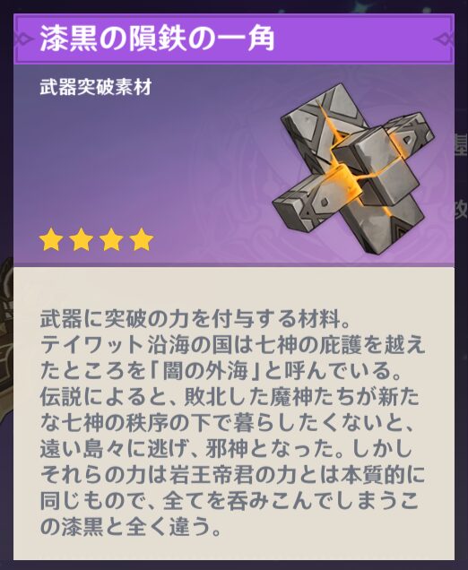 なんかこの世界って、七神の加護が届かない地域っていうのがあるらしいんです。そこは闇の外海と呼ばれているそうで、敗北した魔神たちが邪神としてうようよしているらしいねんな。で、その魔神たちの力というのは本質としてはモラクスと一緒だそうです。ということは、少なくともモラクスは魔神の可能性がかなり高いということになります。