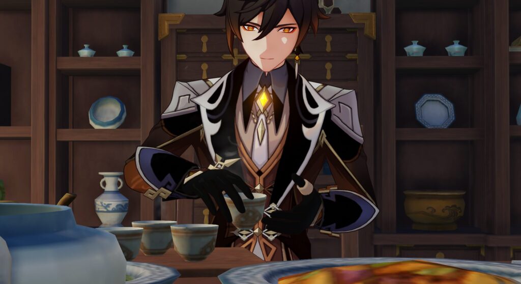 実はこちらの鍾離先生、既に顔と名前を知っています。年末か何かのガチャで見たことあるのよ!!で、僕の記憶が正しければたしか無職のプロ奢られヤーという話だったと思います。えっ、フツーにプー太郎的な何かだと思っていたんですけれど…すごいお高そうな料亭にいるよこの人?!