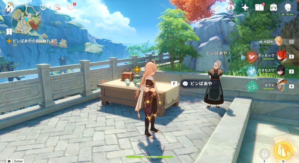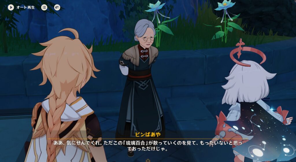 さて璃月に戻りまして、玉景台にてピンばあやを発見しました!なんか花見がどうこうとか言うてるお婆ちゃんですね。で、話しかけますと璃百合という花についてを教えてくれます。