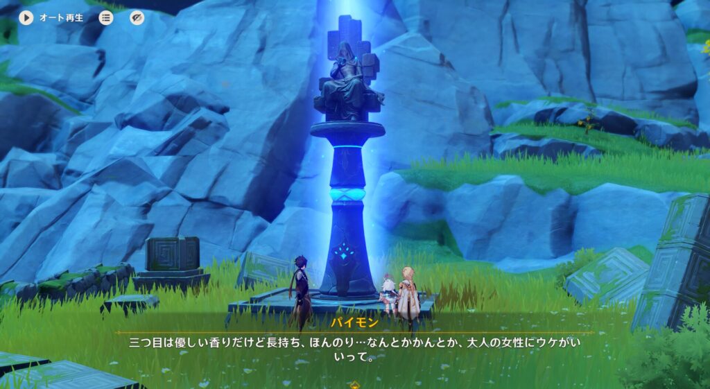 待たせた~?と話しかけたところ、「岩王帝君の神像に刻まれた守衛に比べたら一瞬」と言われました。なんやそれは…多分ですが、この神像はかなり昔からあるとかいう話なんでしょうね。ていうか、神像って建てたのはやっぱ現行の神ってことでええんよな…?