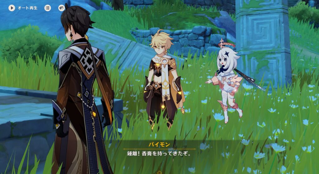 で、鍾離先生は事情があって一緒に行けんから取ってきて、とおつかいを頼まれました。まあ色々葬式の準備があるのかなーとか呑気に思ってたんですけれど、なんかパイモンが「鍾離の様子がおかしい」って言うんですよ…
