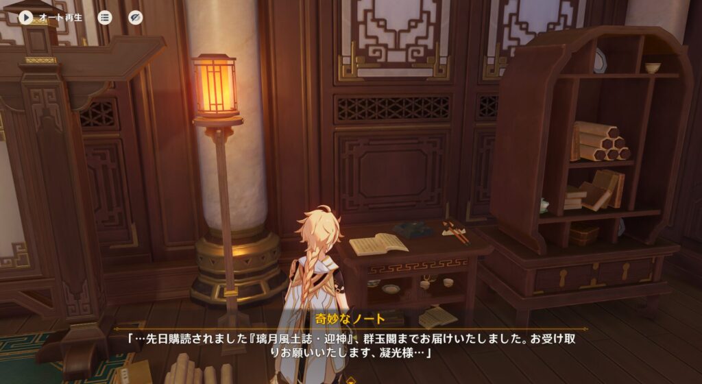 そんで近くには変なノートがありまして、お嬢様が「璃月風土誌・迎神」というのを買っていたことが判明しました。次の岩神を警戒してますよね、これ。あるいは自分が岩神になる自信があるのか…