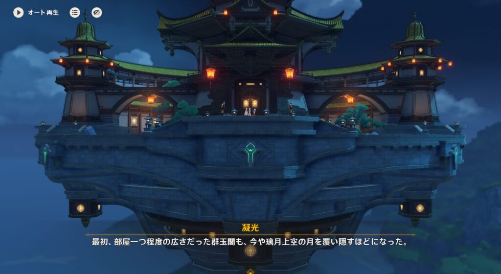 まあそれはちょっと気になるけど、歓迎してくれてるんだから一旦その問題は置いときましょう。まず、凝光お嬢様から群玉閣についての説明をしてもらえます。お嬢様は商人になった時からこの宮殿のための資金を集めていたそうでして、かなり思い入れのある建物のようですね。