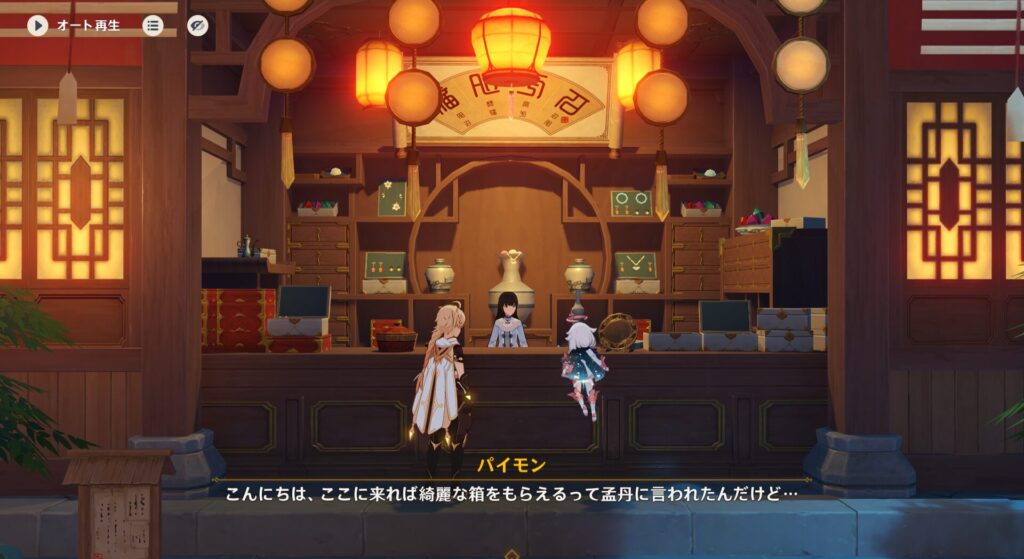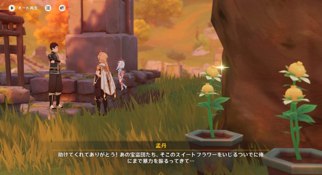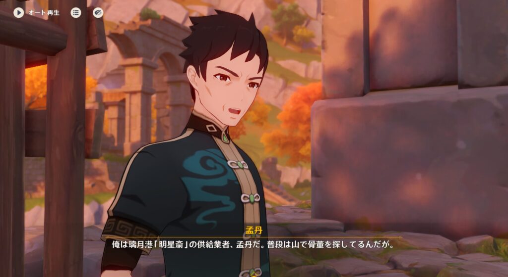 助けたのは明星斎の仕入れ業者の孟丹という人でして、普段は璃月の山とかで骨董を探しているらしいです。つまり遺跡からの出土品とかかな?ていうか、えっ、それお前盗掘っていうんじゃ…いやもしかすると璃月の法律では遺跡の文物ってわりと気軽に漁っていい可能性あるから!うん!そこは深く気にせんとこ!