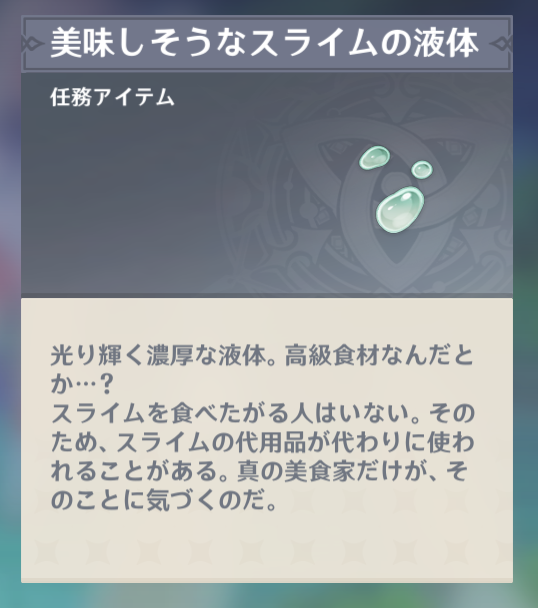 ちなみに妖怪自身は大好物っぽいんですけれど、テイワットにおいてスライムというのは一般的に食材ではありません。凝光お嬢様に無礼があったらそこそこ大変なことになると思うんですけれど、お前それホンマに大丈夫やろうな?!