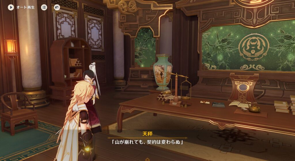 で、モラクスの死骸を隠した件について432さんが聞いたんですが…まず、「新たな時代でも七星は帝君の民だから殺したりなんかしないよ」と釘を差されました。これに関してはファデュイがどうせ殺ったんでしょという感じではありますが、七星の疑いが晴れたわけではないって感じです。
