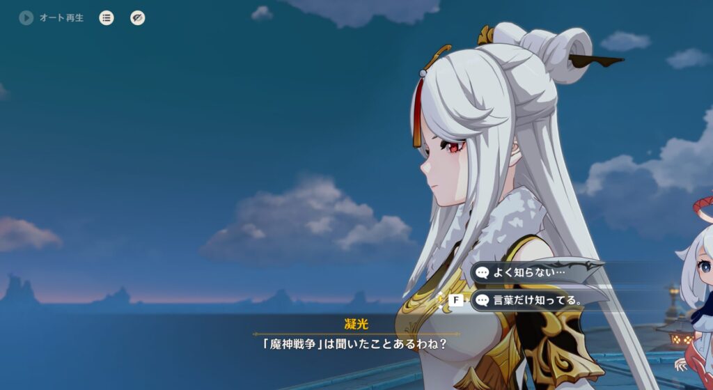 で、凝光お嬢様とのんびりお喋りをしていますと、なんとここでお嬢様が魔神戦争について聞いてきます。ずっと前から名前は聞いてるけども全然内容が分からんかったヤバそうな戦争ですね。現入手の書物にも残ってないんだからな…!