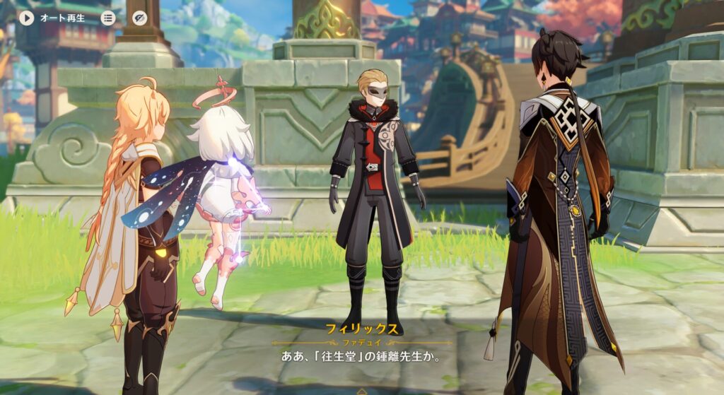 ですが持ってた神の目が水だったし、確実に水系ということが分かるだけでも儲けもんだぜ!というわけで町に帰りますと、千岩軍とファデュイがうろうろしていました。そのうちのフィリックスというのが鍾離先生に話しかけてきます。