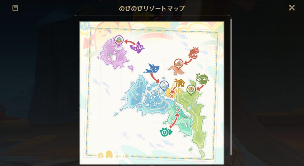 さてこののびのびリゾートですが、全容は大体こんな感じです。イベント1つで使うマップにしてはかなり広いよな?!実はイベントが終わった後もこのマップって残るらしいよ。