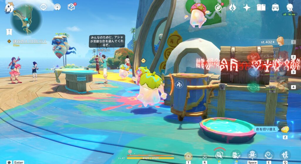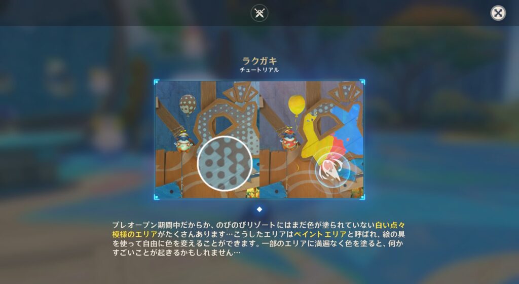 さてこのリゾートなんですが、探索度アップのためにとある特殊な操作がいるっぽいんですよね…それがこちらでして、ラクガキというものになります。これ何かといいますと、さっきのアシャっていう奴に乗り移って絵の具を発射し、マップのあちこちにある空白のところを塗るという作業です。