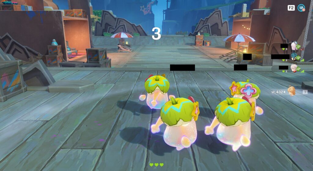 これがカラフルスプラッシュだったかな?アシャになってフィールドをラクガキしまくるというスプラトゥーン的なゲームです。対戦ゲームではないのがせめてもの救いですが、なんとこれオンラインでランダムでチームが組まれるのである…