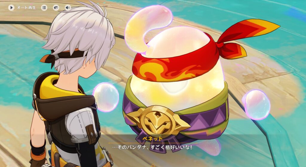 お前もしかしてギャンブラーか?!だとしたらキィニチさんとは仲悪いと思うけど…とちょっと心配しましたが、彼はギャンブラーではありません。彼の言うラッキーとは、ドブに落ちなかったとか、船にちゃんと乗れたとか、鳶に昼飯を盗まれなかったとか、そのレベルです…どうやらベネットくんは不幸体質のバッドガイらしいんですよ。てか、普段バッドラックなやつがラッキーになる時って何かヤバいこと起きる前兆じゃないの?!※勿論、起きます。