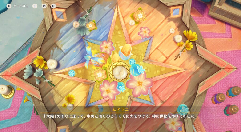 太陽を囲んで座り中央と周囲の蝋燭に火をつけて炎神に供物を捧げると、その煙と一緒に人々の願いが神に届くという儀式らしいです。で、その時に俗世の悪い力は炎にのまれて浄化され、炎と一緒にいいエネルギーが強くなるらしいよ。エネルギーを入れ替える古い儀式ということなんですが…