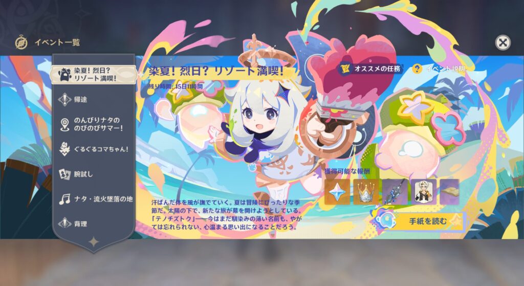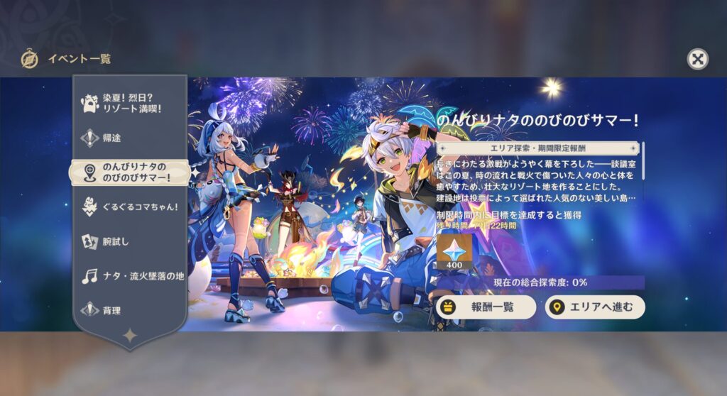 それではちょっと色々ありましたが!ついに夏イベに入っていこうと思います。2025年夏イベ!のんびりナタののびのびサマーです!!舞台は当然ナタ!すげーバカンスっぽくていいよな!しかもこのイベント、新規マップが出るとかいうまあまあデカめのイベントらしい。