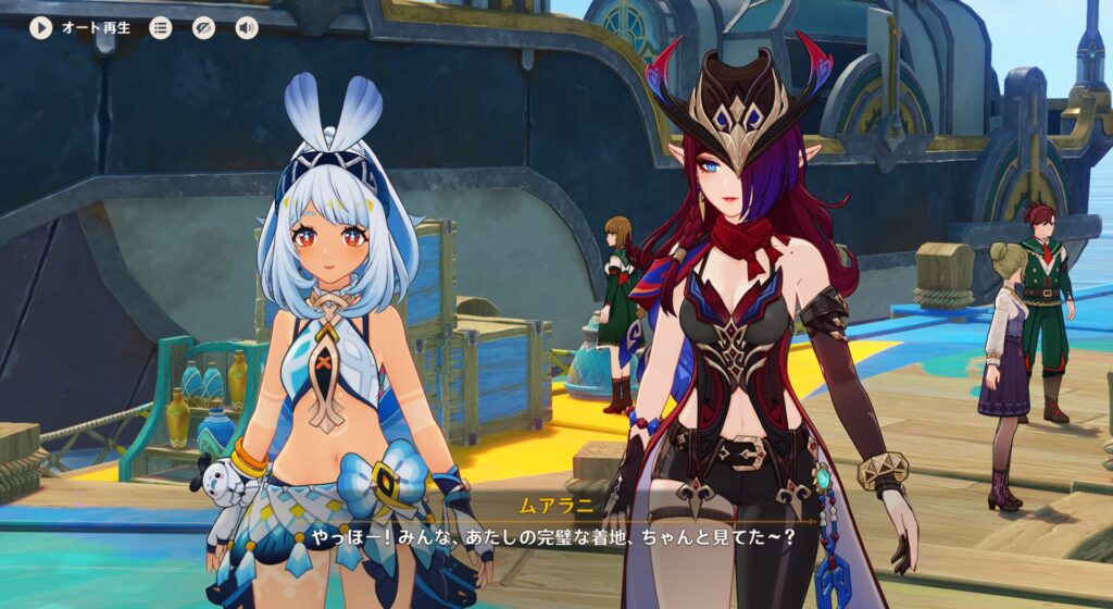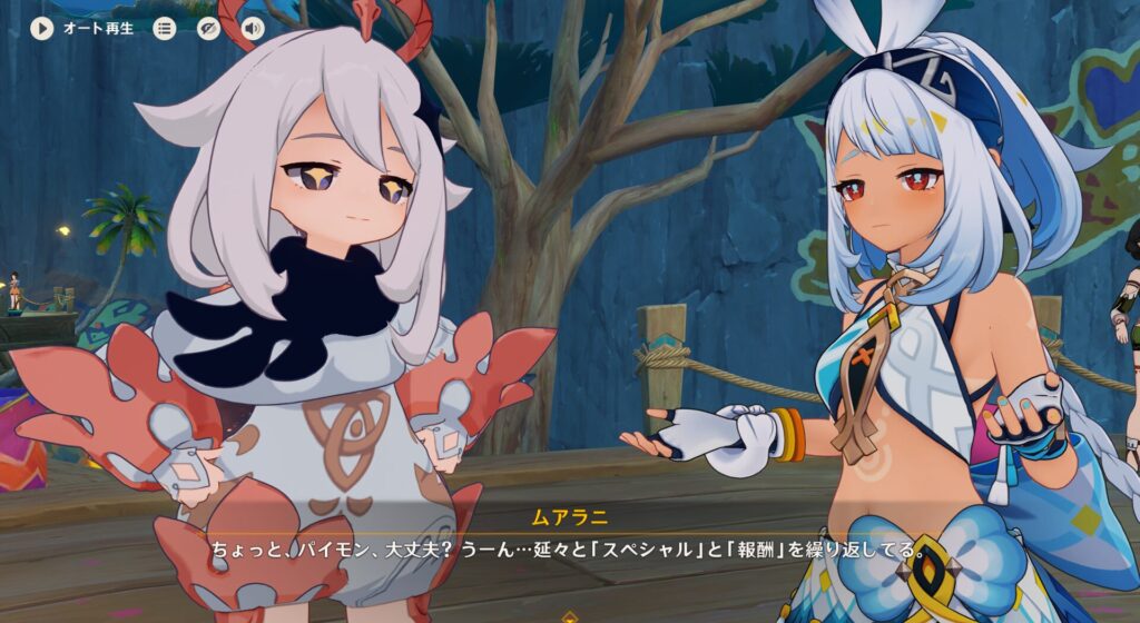 そんでこの2人がリゾートに来た理由ですが、ムアラニちゃんはガイドをしているので職務上リゾートを偵察に来たみたいですね。チャスカちゃんはフツーに親族を連れて遊びに来たいので下見だとか。ちなイファさんとオロルンも来てるって!リゾートで働く竜とかミツムシのお医者をしているらしい。おー!あの2人とも会えるのか。いいじゃん!