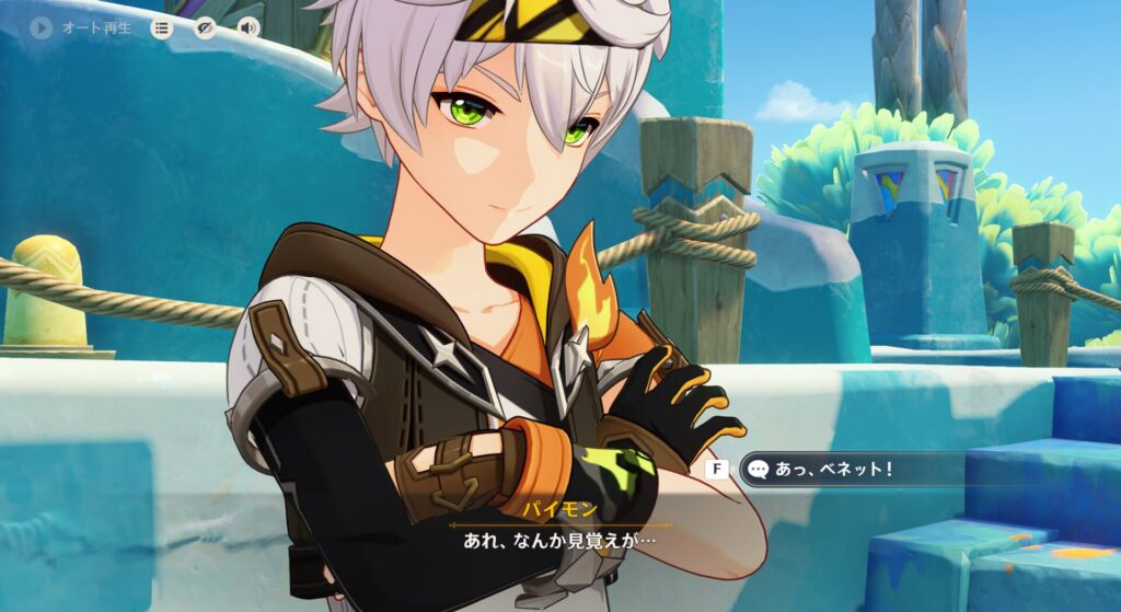 で、どうやら432さんはこのベネットくんと知り合いのようです。出会い頭に「パイモンと432さんじゃん!夢じゃないよな?!」って言われたんですが、え、432さん死んだと思われてんのか?!あるいはそれくらい長く会っていなかったのでしょう。ちなみにここはナタを救った後の世界線のようです。