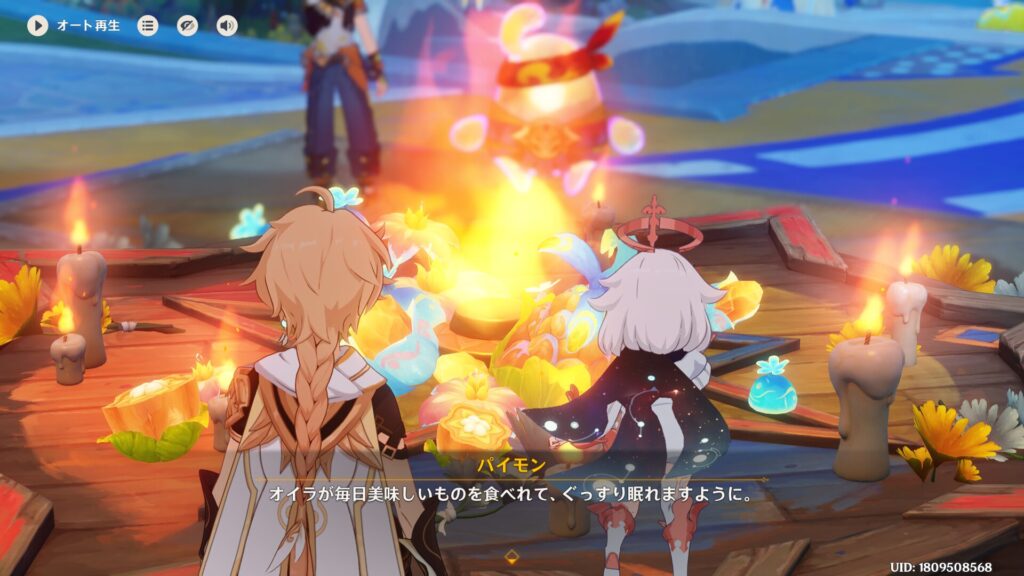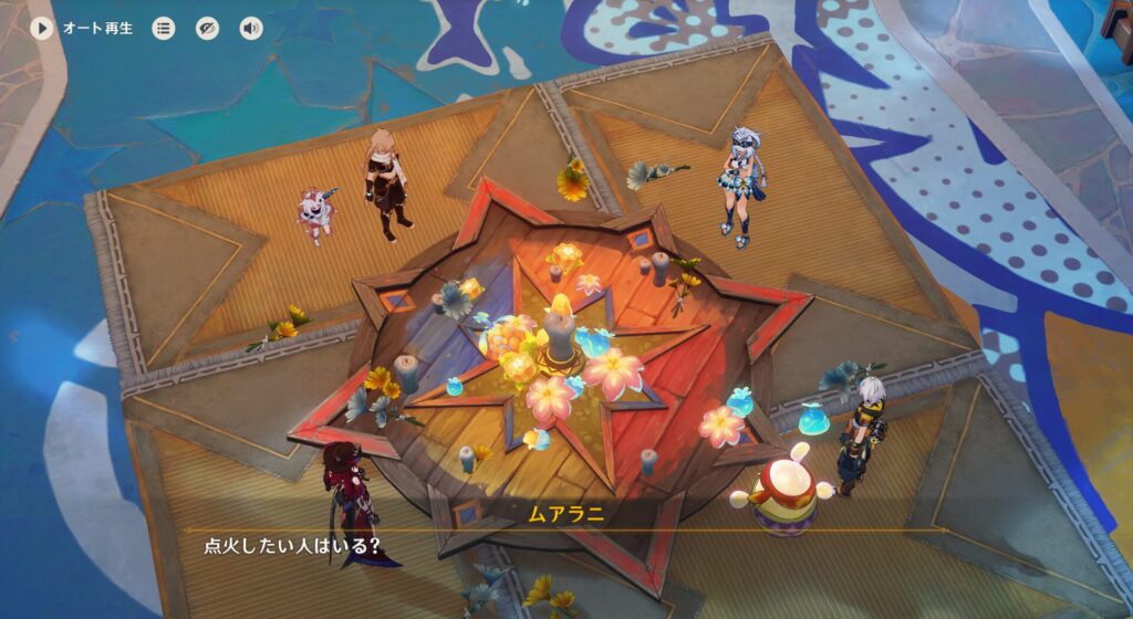 なんかフルーツとか蝋燭とかを燃やして炎神に祈りを捧げるとかいう話でしたよね。ベネット団長は「自分はナタ人じゃないし、炎神に願いが届いても誰だか分かんないのでは?」と心配していましたが、細かいことは気にすんなっ☆こっちなんか星外生命体やぞ。