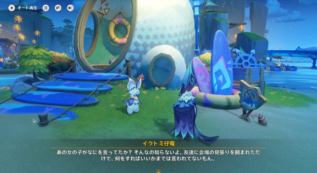 このドラゴンの話した内容は「見張りを頼まれたけど具体的な指示がないから、もう分からんからぼーっとしてんねん」みたいな話だったと思います。一見可愛い~!みたいな奴が小生意気だったりするのちょっと面白いよなwwwちなイファさんの連れてるカクークもリオセスリニキが「可愛い可愛い!」と羨ましがってましたが、中身はまあまあ強烈らしいですwww