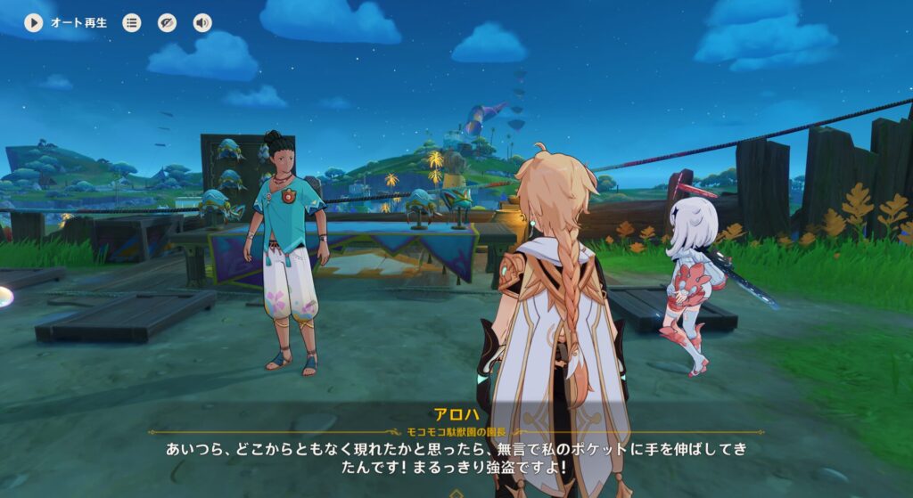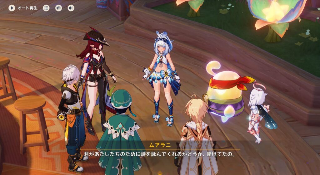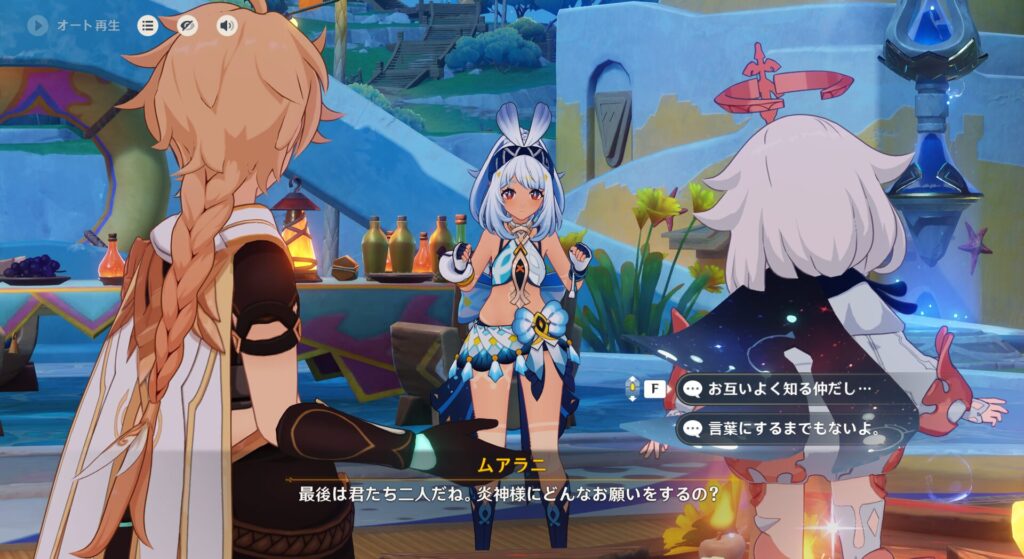 だからベネット団長が璃月の山で遭難したりスメールの砂漠で行方不明になったりしなかったのは、何でかしらんけど今回に限ってラックにバフがかかっていたんでしょうね。で、普段のラックの低さに関してはムアラニちゃんも心配してくれたようでして、「シトラリばあちゃんは占いが得意だから危機察知のために何かを教えてくれるかも!」と言ってくれました。やさしっ!
